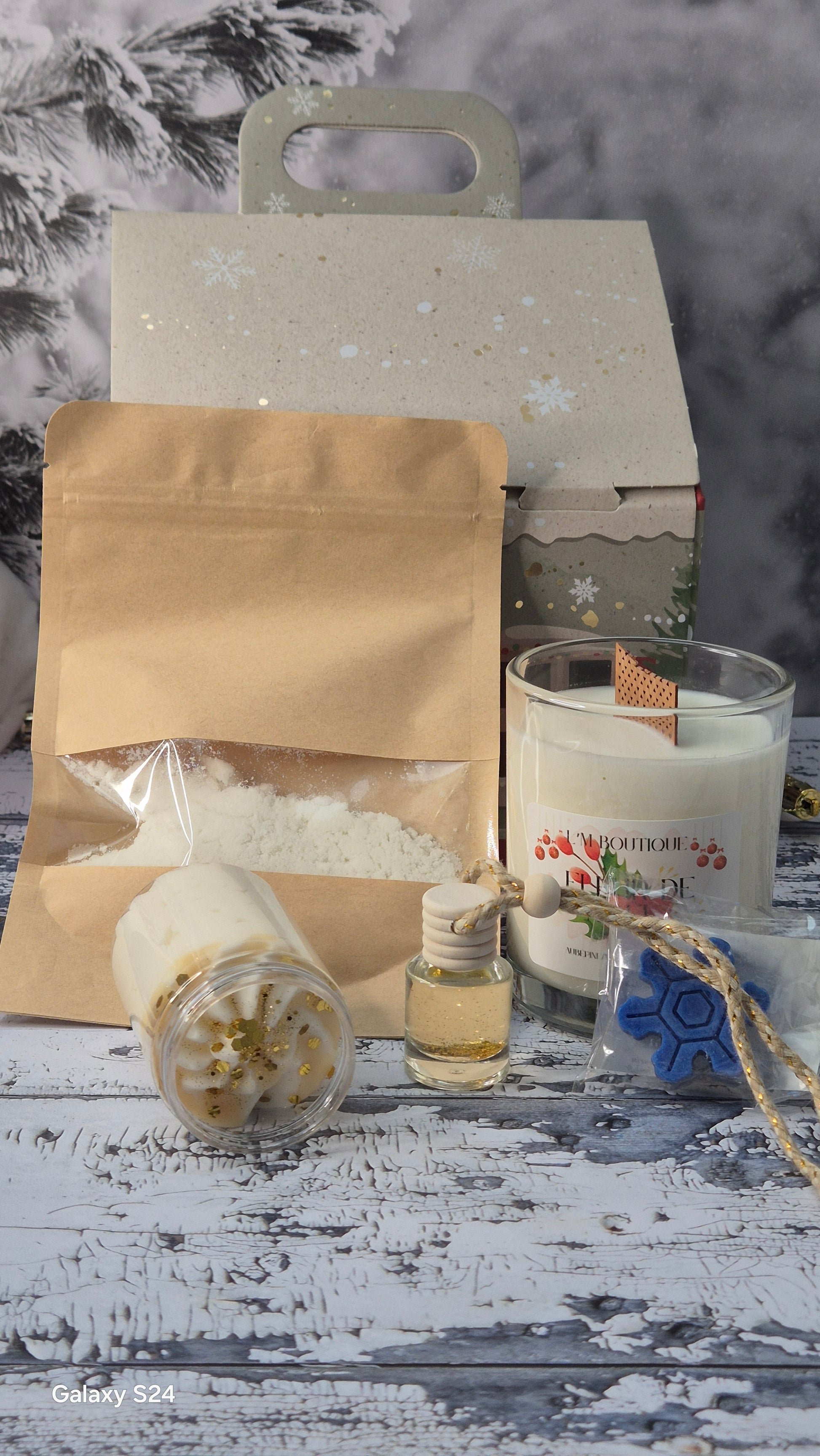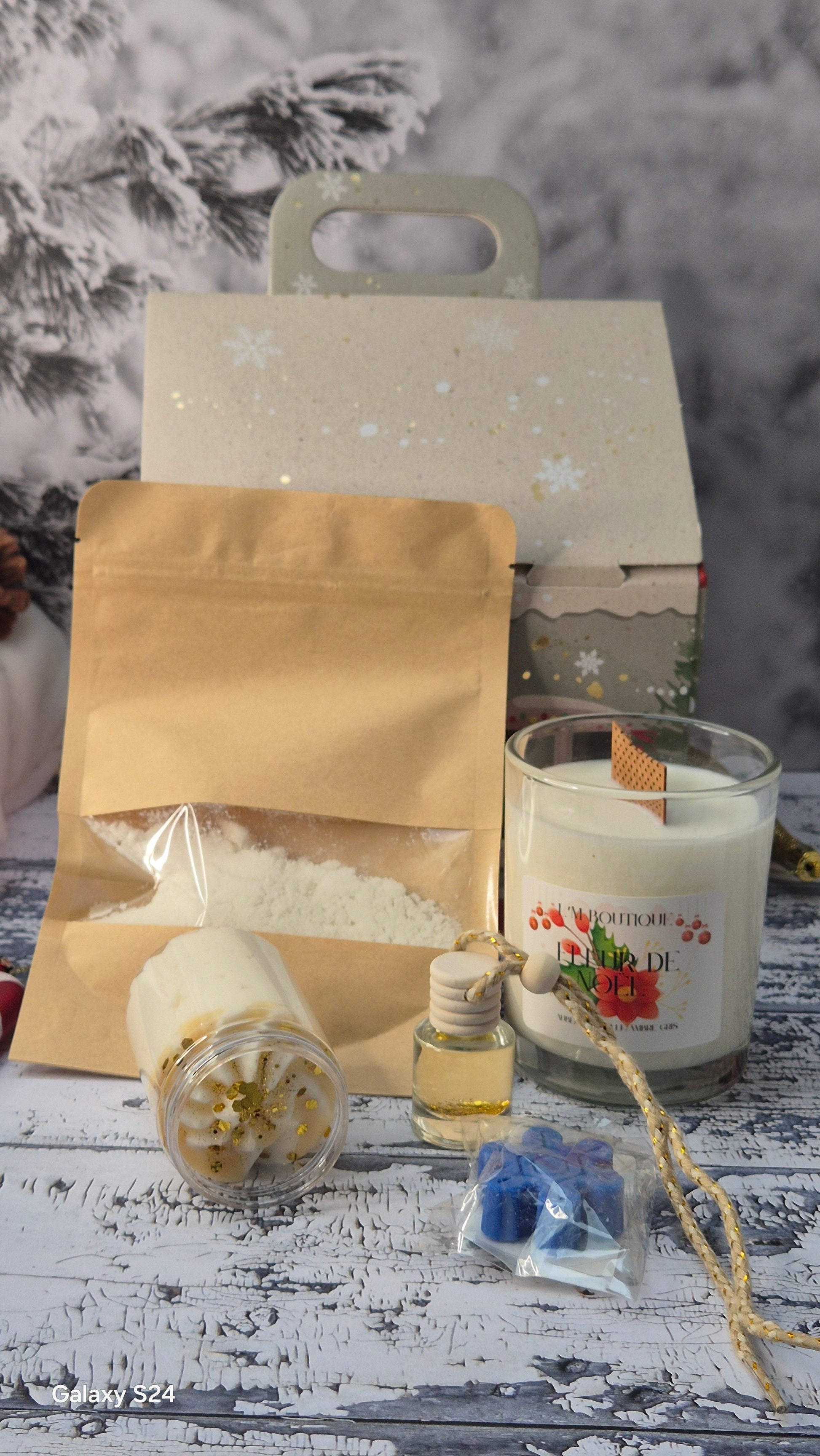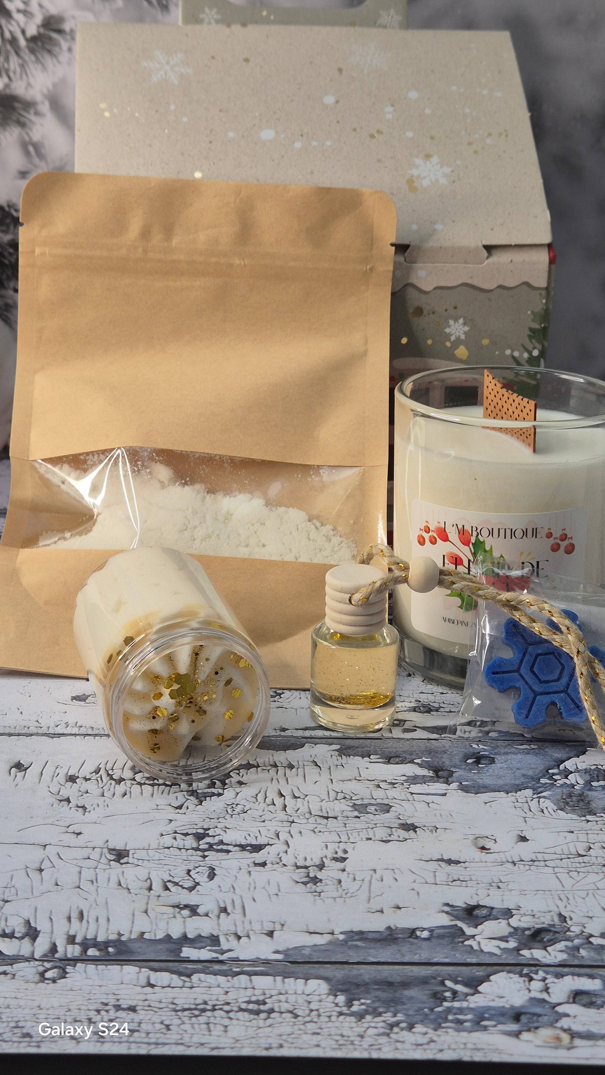 Une bougie mèche en bois senteur fleur de noël, une poudre d’aspirateur senteur couronne de gui, une fiole voiture senteur douceur de caramel, un fondant crémeux senteur ferrero rocher. Un fondant solide senteur sucre d’orge.